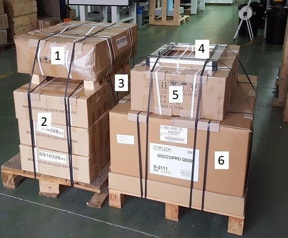 Recibirá los equipos y utensilios en bultos compactos para facilitar la logística y reducir costes de transporte. Los equipos ya bienen semi-montados para que pueda terminar de montarlos e instalarlos en su taller o local sin dificultad. En este ejemplo el taller entregado sería el Taller de serigrafía 200 XL y contendría:
