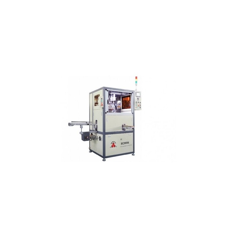 Máquina de 8 estaciones para la estampación de productos cilíndricos. Contiene un sistema de limpieza antiestática del polvo antes del estampado, para limpiar el objeto para no cometer un error en el diseño. También, tiene un indicador para obtener una alta precisión, una preinscripción automática opcional (cuando hay un punto de registro), una cabeza de estampado en el rodillo, un cinturón de carga automática con cargador automático opcional y un control del PLC con pantalla táctil. La máquina cumple los requisitos de seguridad CE.