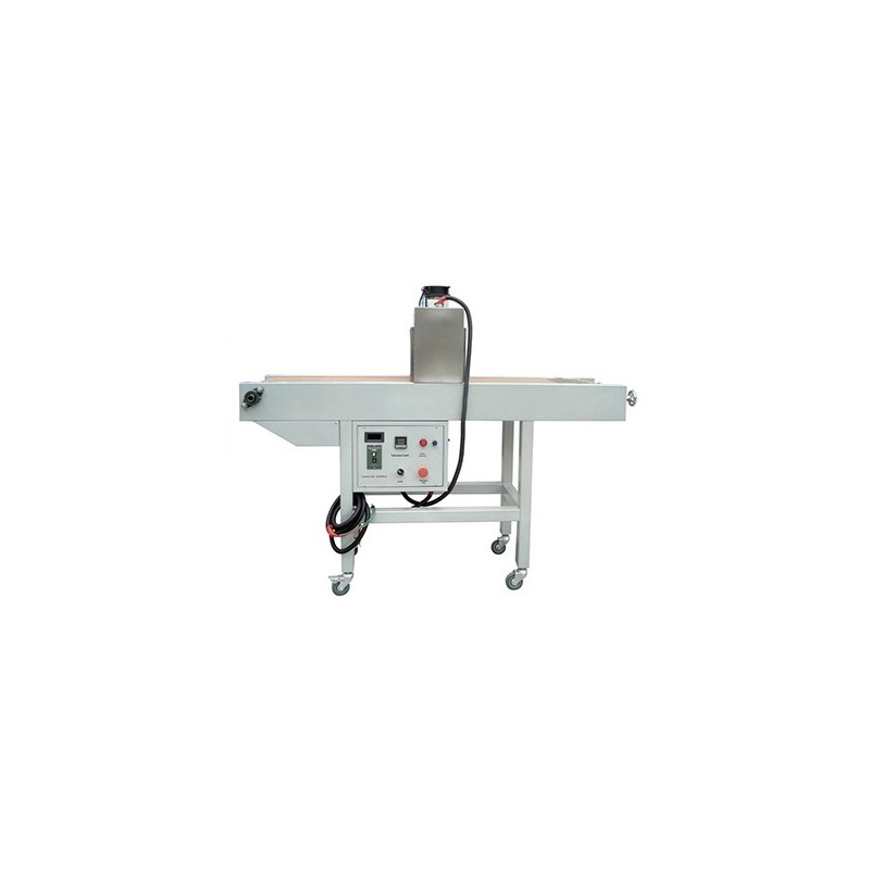 CIR 300 has a system of high efficiency lamps that emit IR light for curing screen prints (heating power of 4.2KW). It is a screen-printing drying tunnel designed to be installed in production lines, where the height of the product inlet mouth is adjustable. Its manufacture with stainless steel and the reinforcements on the conveyor belt ensure a great durability of the device. It also has an internal air recirculation system and a cooling system for the air released to maintain a pleasant work area. It is important to mention that CIR 300 allows you to regulate the transit speed of the tape progressively, in addition to adjusting the temperature from room temperature to 180 degrees Celsius.