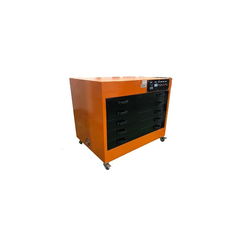 The HS-107 drying oven for screen printing has been created to perform a perfect screen printing cure for your narrow and small products. The drying oven can reach a maximum temperature of 100º, taking into account that the temperature can vary 5º (+/-). The oven has 15 stainless steel trays to be able to carry out several dryings at the same time and save you time and money. Thanks to your automatic shutdown programmer, it will also help you save time in your work, because once the curing is finished, the warning alarm sounds.