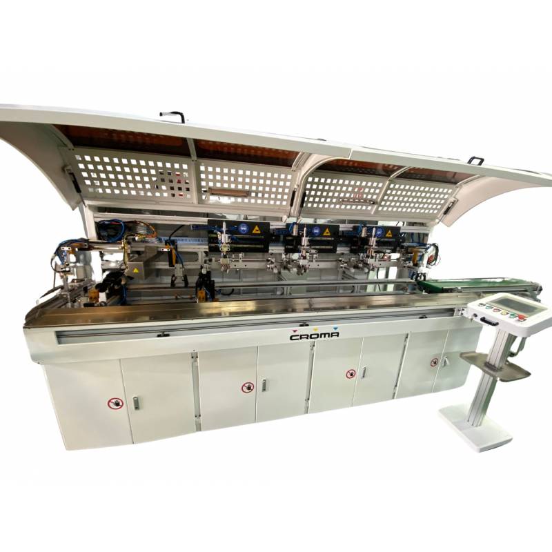 A-401SM foi especialmente projetada para serigrafia em várias cores de objetos cilíndricos, como garrafas e copos de metal, plástico e vidro. Seu funcionamento é totalmente automático por meio de um servomotor, assim como sua carga e descarga de produto. Esta característica o torna muito adequado para instalação em linhas de produção. Para serigrafia com tinta UV, o sistema aplica um tratamento UV LED para pré-secagem antes de aplicar uma nova cor de forma totalmente automática. Também existe a opção de usar tintas hot melt.